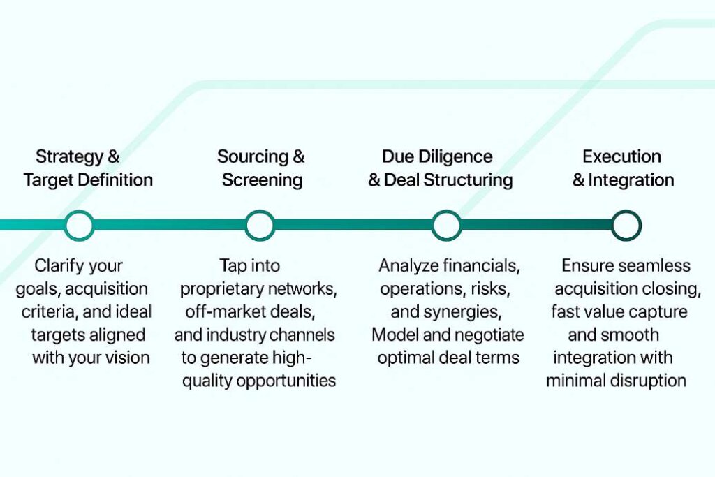 End-to-End Support — From initial target scouting through post-acquisition integration, we stay beside you.